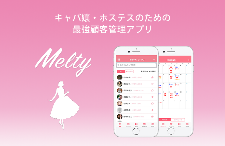 Meltyはキャバクラで働いている女性のための顧客管理を主として総合アプリです。 顧客管理をアプリで行うことで、各顧客の情報を正確に記録し、前回の来店でお話しした内容を次回お話しすることができたり、誕生日通知により忘れることなく各顧客にメッセージを送ったり、プレゼントを渡すことで、顧客の心をしっかりと掴む事ができます。 顧客管理の他にカレンダー機能で自分の予定や来店履歴を登録できたり、コラム機能でキャバクラ関係・ファッション関係の最新記事をアプリ上で閲覧することもできるので、総合的にキャバクラで働いている女性をバックアップするアプリとなっております。